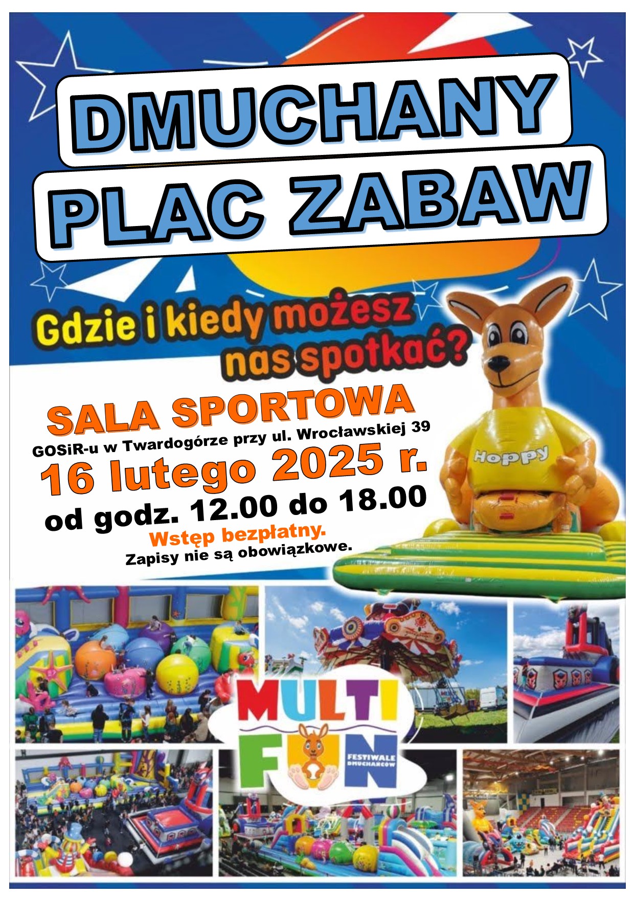 Zapraszamy na bezpłatny “ Dmuchany plac zabaw”, który będzie otwarty w dniu 16 lutego 2025 r. od godz. 12.00 do 18.00 w sali sportowej przy ul. Wrocławskiej 39 w Twardogórze.