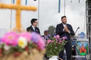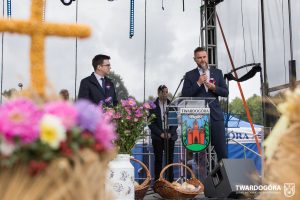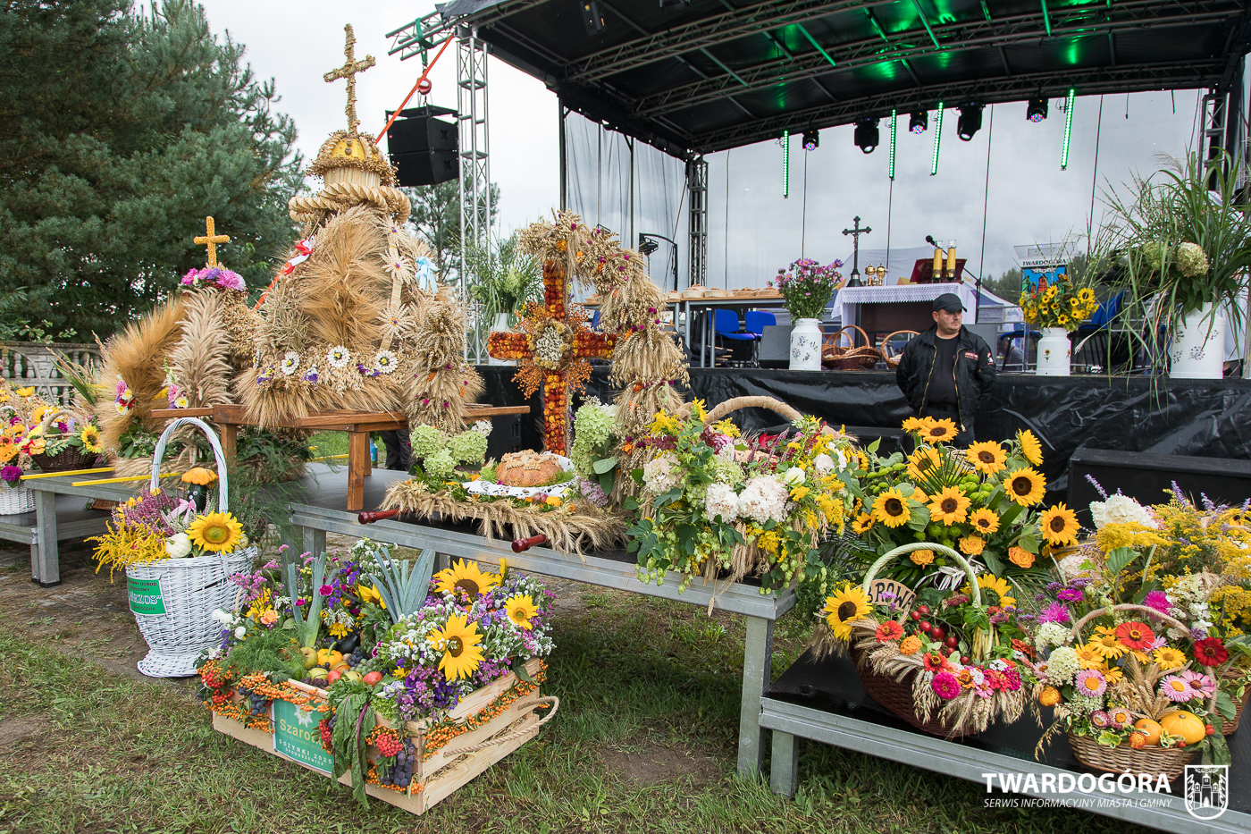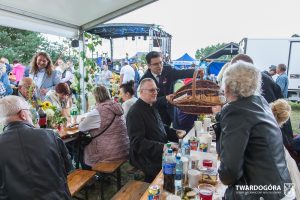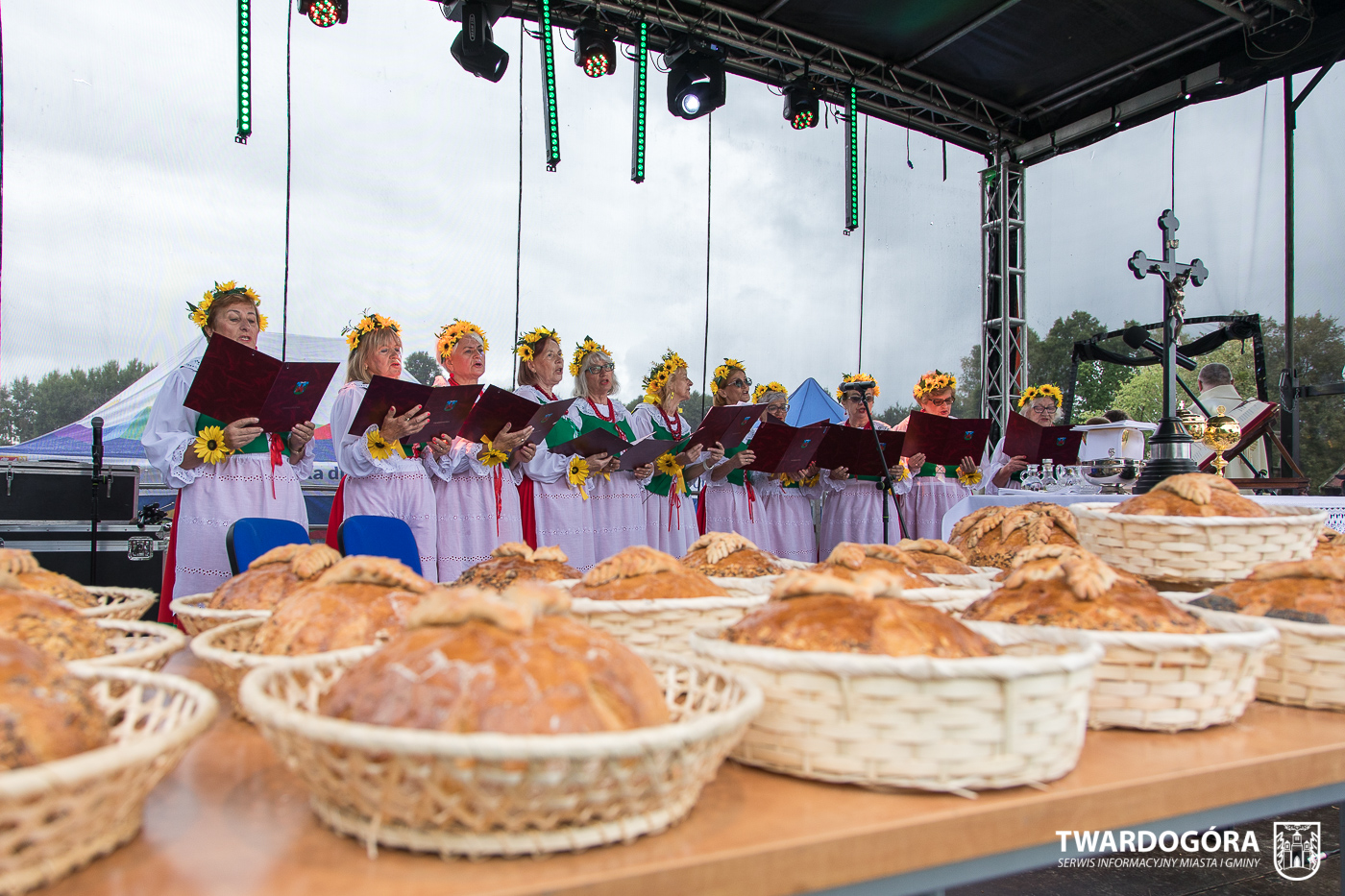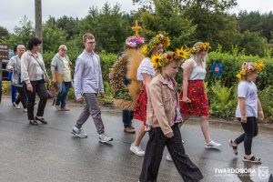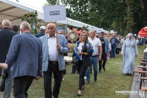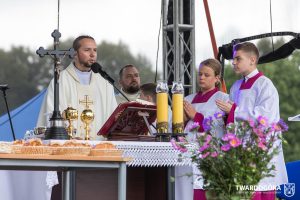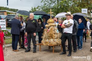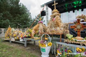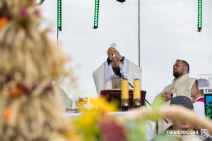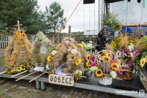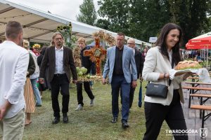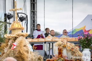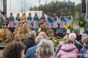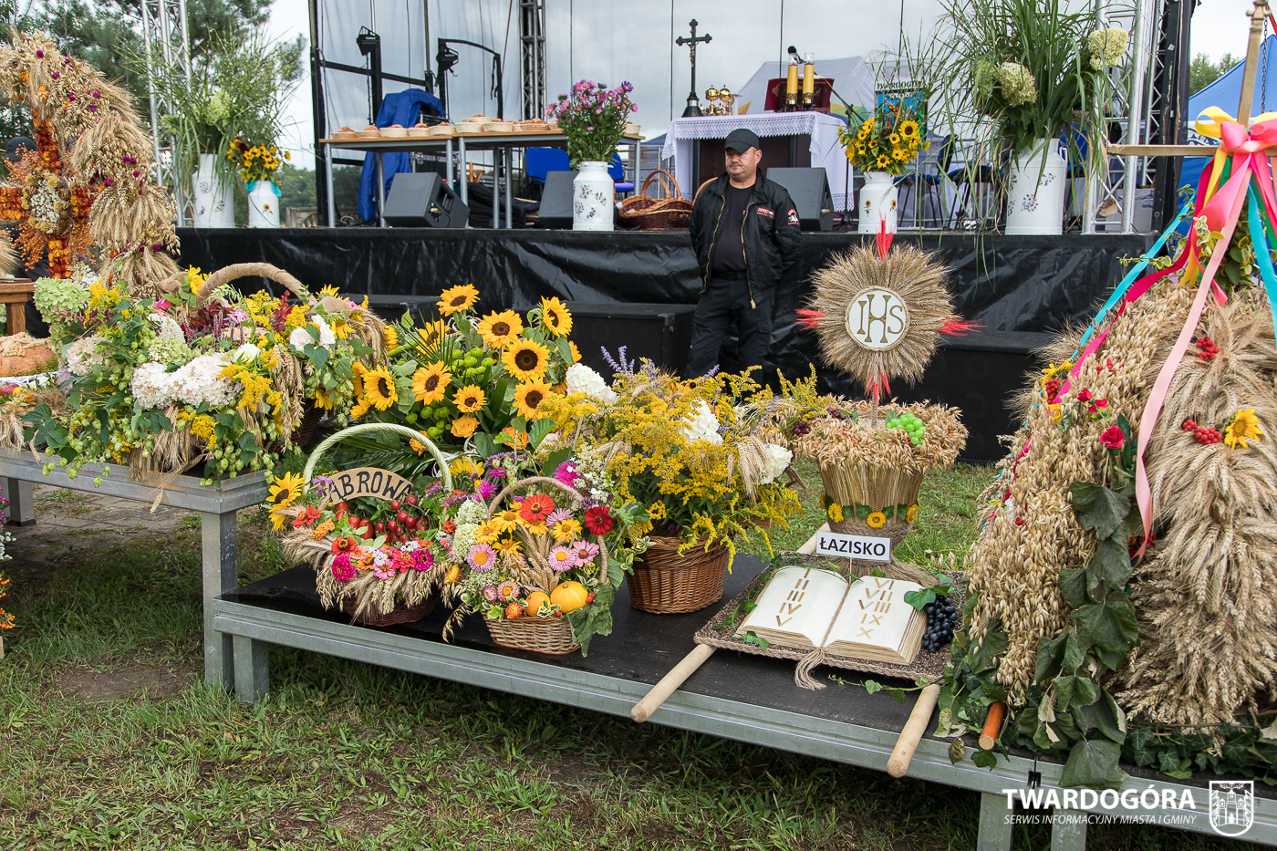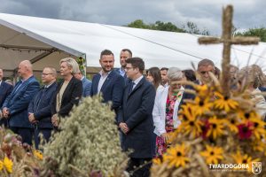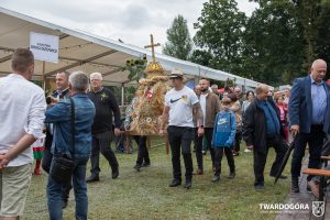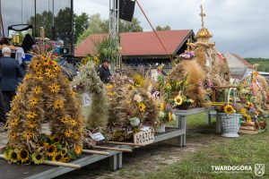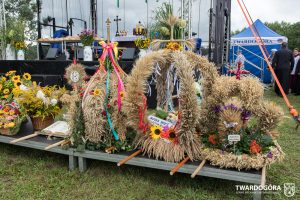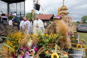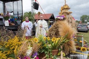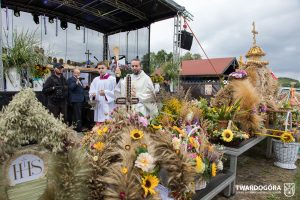 O godzinie 15.00 odprawiona została uroczysta Msza Święta dziękczynna, koncelebrowana przez proboszcza twardogórskiej parafii ks. Tomasza Hawrylewicza oraz proboszcza parafii Goszcz ks. Jana Napierałę. Po nabożeństwie poświęcono chleby, wieńce i kosze z plonami złożone pod ołtarzem polowym, a następnie starostowie przekazali symboliczny bochen burmistrzowi oraz wszystkim zgromadzonym delegacjom. Andrzej Zarówny przeczytał również list od członkini Zarządu Województwa Dolnośląskiego Natalii Gołąb.
