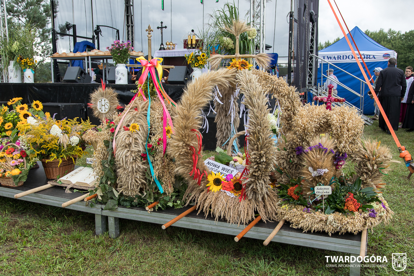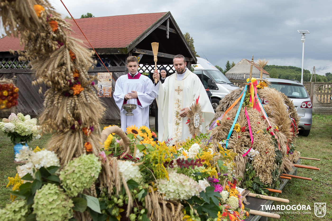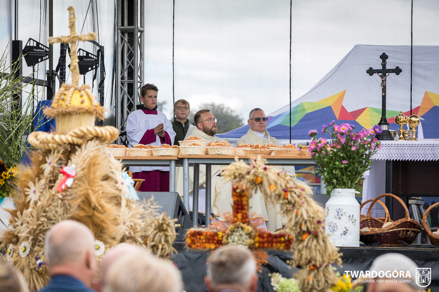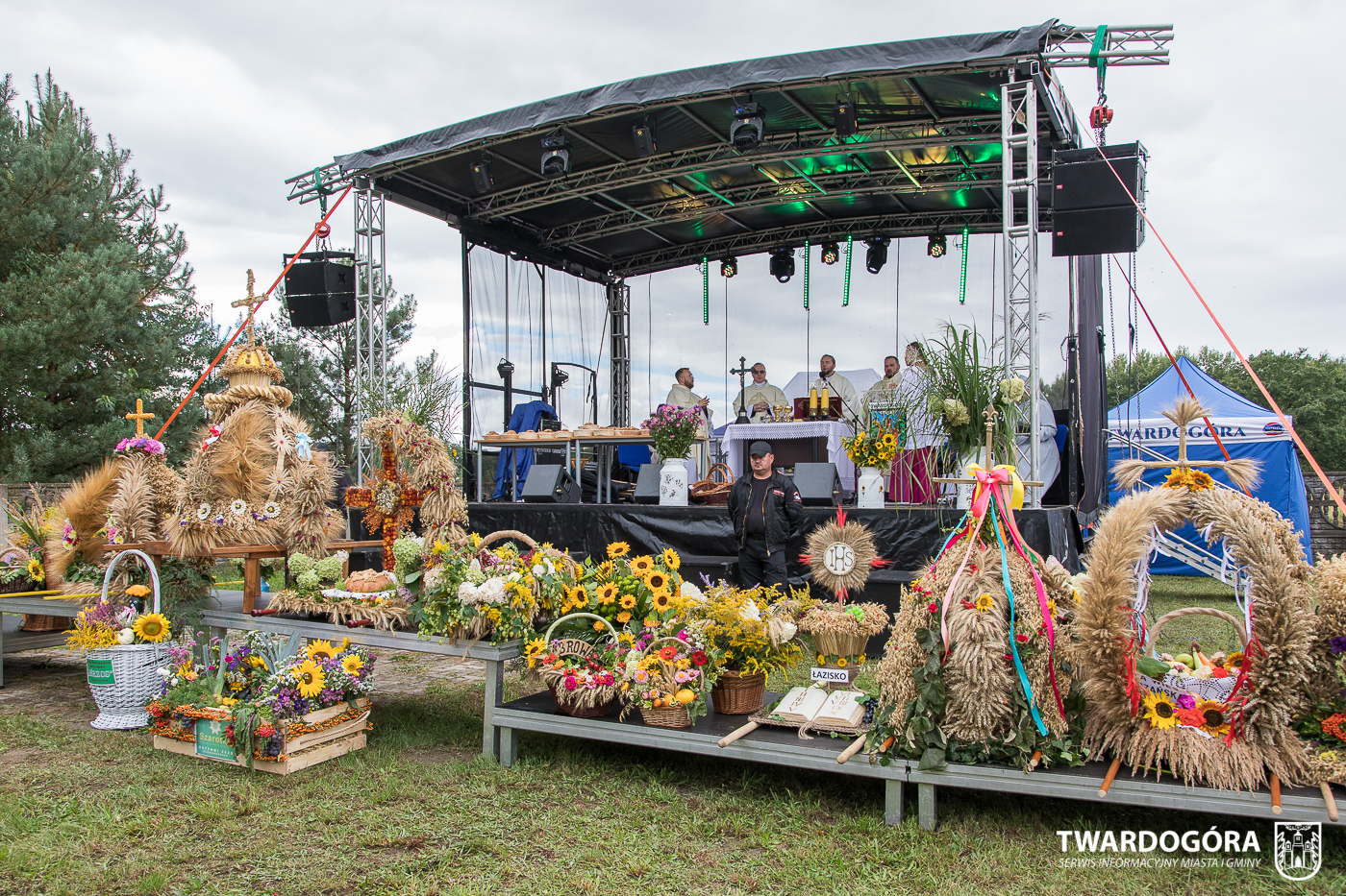 O godzinie 15.00 odprawiona została uroczysta Msza Święta dziękczynna, koncelebrowana przez proboszcza twardogórskiej parafii ks. Tomasza Hawrylewicza oraz proboszcza parafii Goszcz ks. Jana Napierałę. Po nabożeństwie poświęcono chleby, wieńce i kosze z plonami złożone pod ołtarzem polowym, a następnie starostowie przekazali symboliczny bochen burmistrzowi oraz wszystkim zgromadzonym delegacjom. Andrzej Zarówny przeczytał również list od członkini Zarządu Województwa Dolnośląskiego Natalii Gołąb.