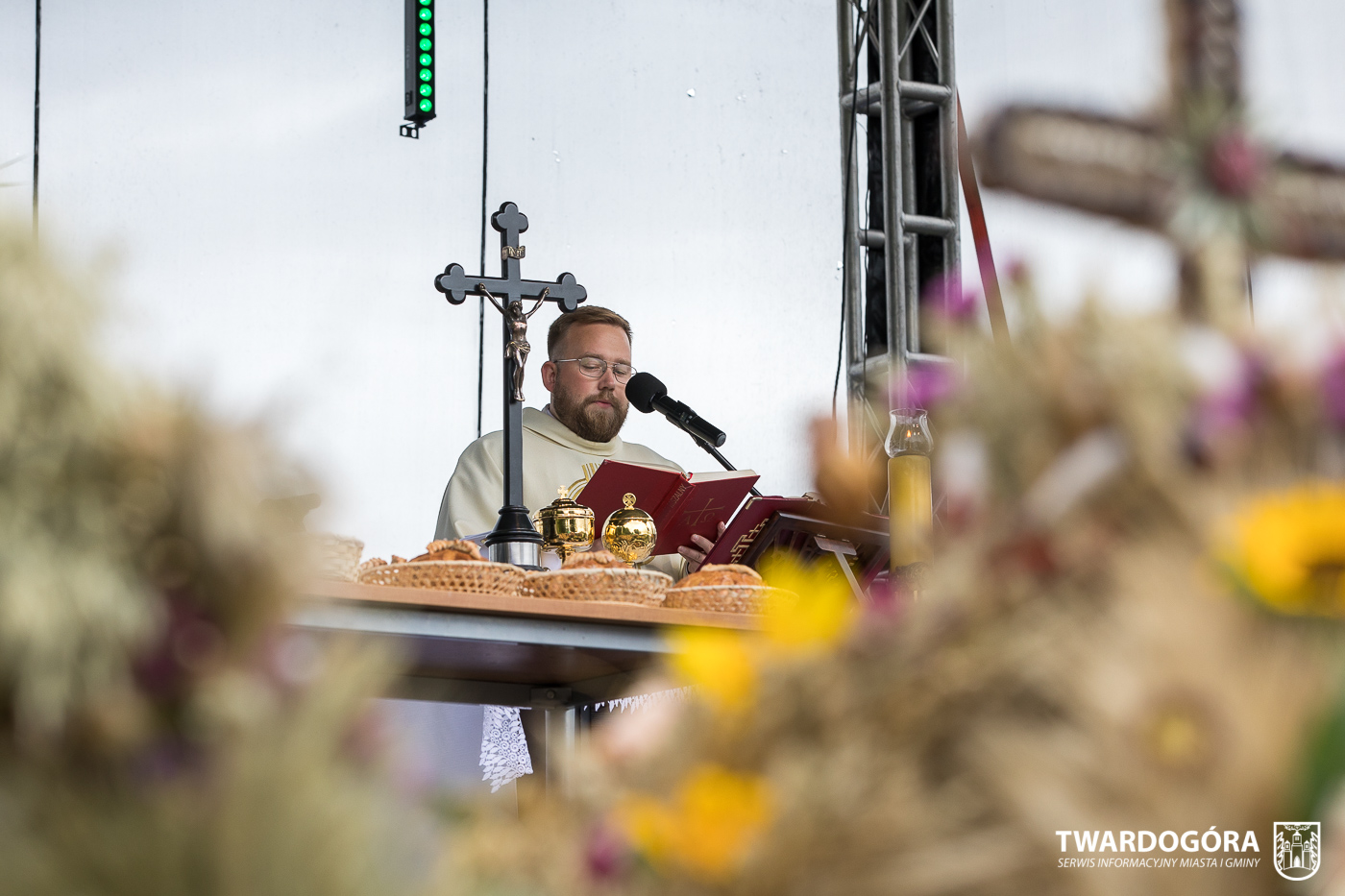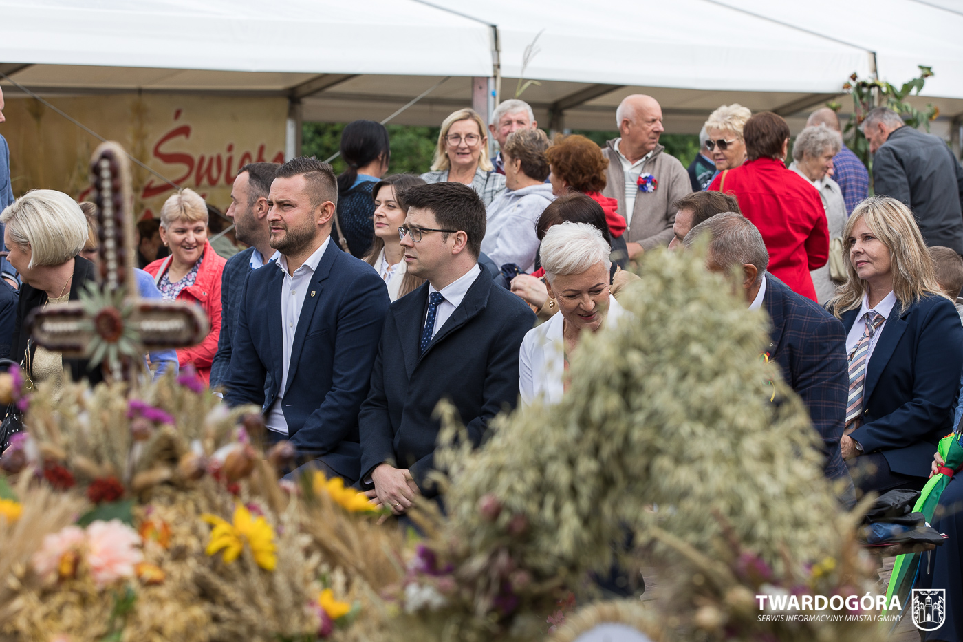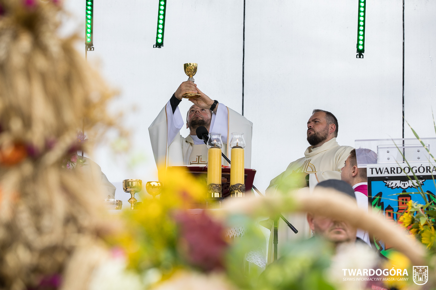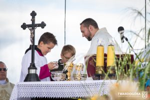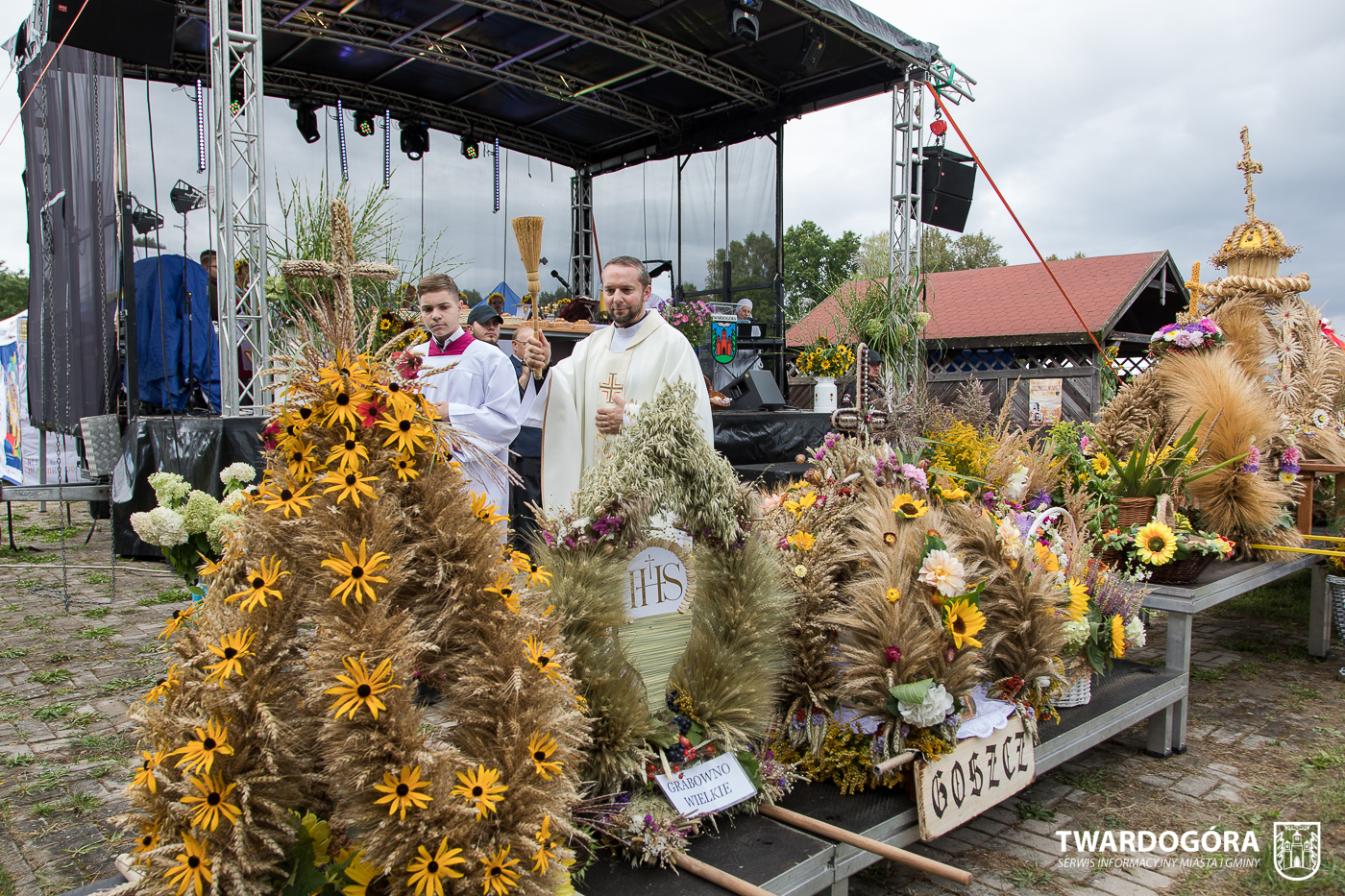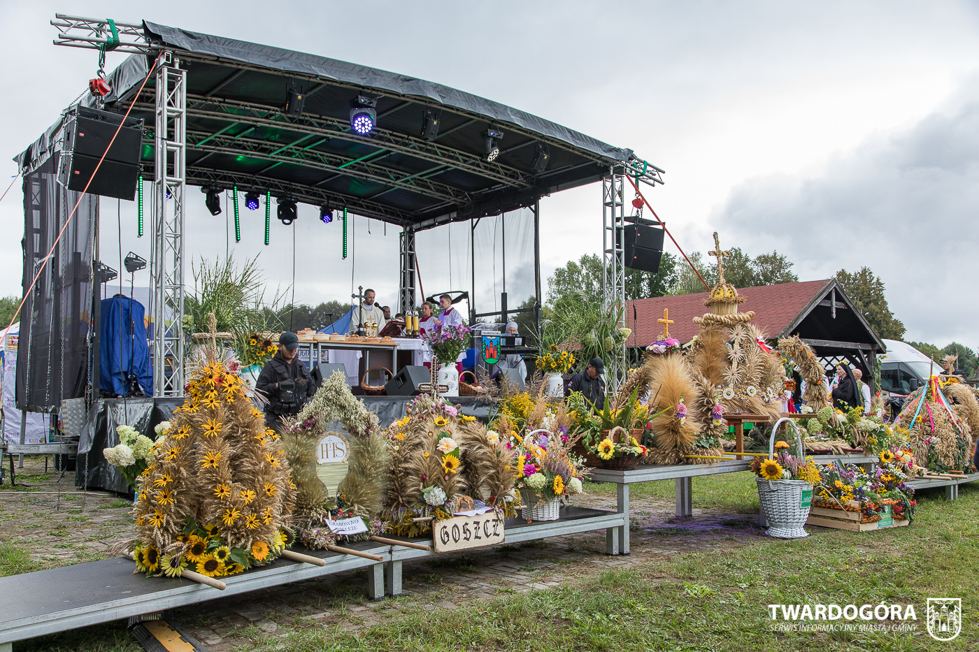 O godzinie 15.00 odprawiona została uroczysta Msza Święta dziękczynna, koncelebrowana przez proboszcza twardogórskiej parafii ks. Tomasza Hawrylewicza oraz proboszcza parafii Goszcz ks. Jana Napierałę. Po nabożeństwie poświęcono chleby, wieńce i kosze z plonami złożone pod ołtarzem polowym, a następnie starostowie przekazali symboliczny bochen burmistrzowi oraz wszystkim zgromadzonym delegacjom. Andrzej Zarówny przeczytał również list od członkini Zarządu Województwa Dolnośląskiego Natalii Gołąb.