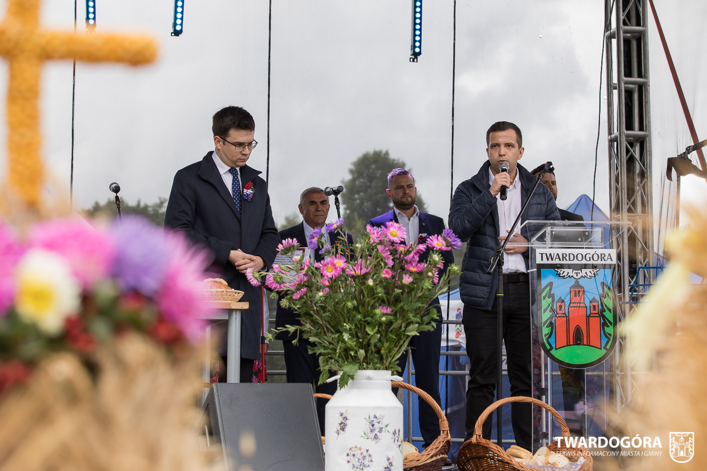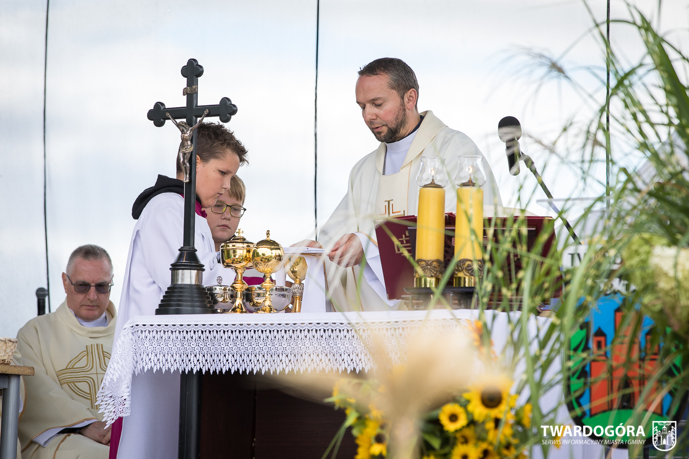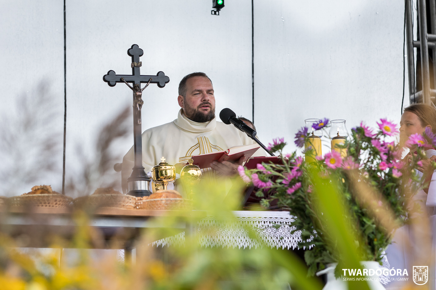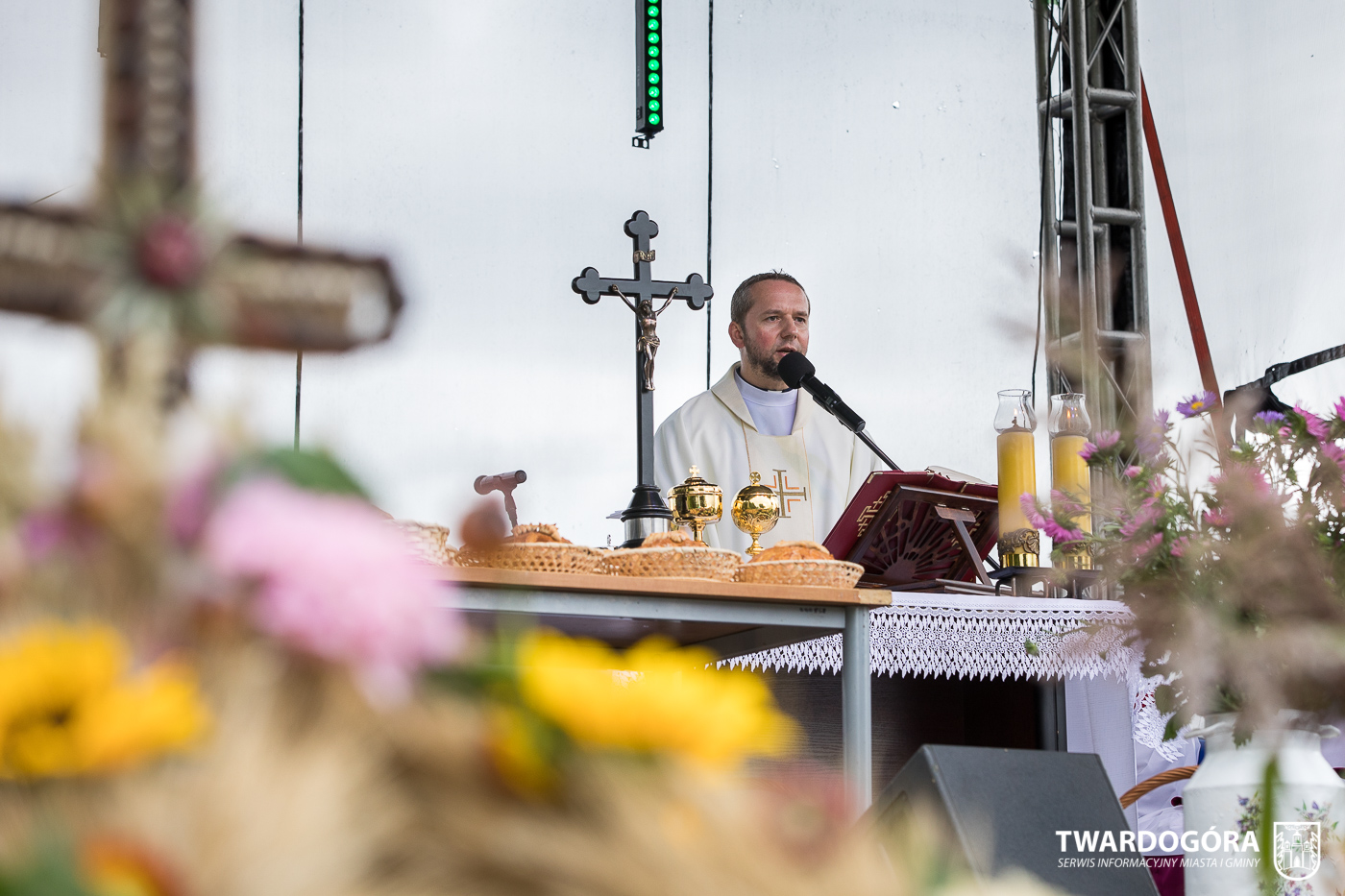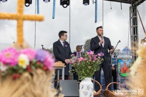 O godzinie 15.00 odprawiona została uroczysta Msza Święta dziękczynna, koncelebrowana przez proboszcza twardogórskiej parafii ks. Tomasza Hawrylewicza oraz proboszcza parafii Goszcz ks. Jana Napierałę. Po nabożeństwie poświęcono chleby, wieńce i kosze z plonami złożone pod ołtarzem polowym, a następnie starostowie przekazali symboliczny bochen burmistrzowi oraz wszystkim zgromadzonym delegacjom. Andrzej Zarówny przeczytał również list od członkini Zarządu Województwa Dolnośląskiego Natalii Gołąb.