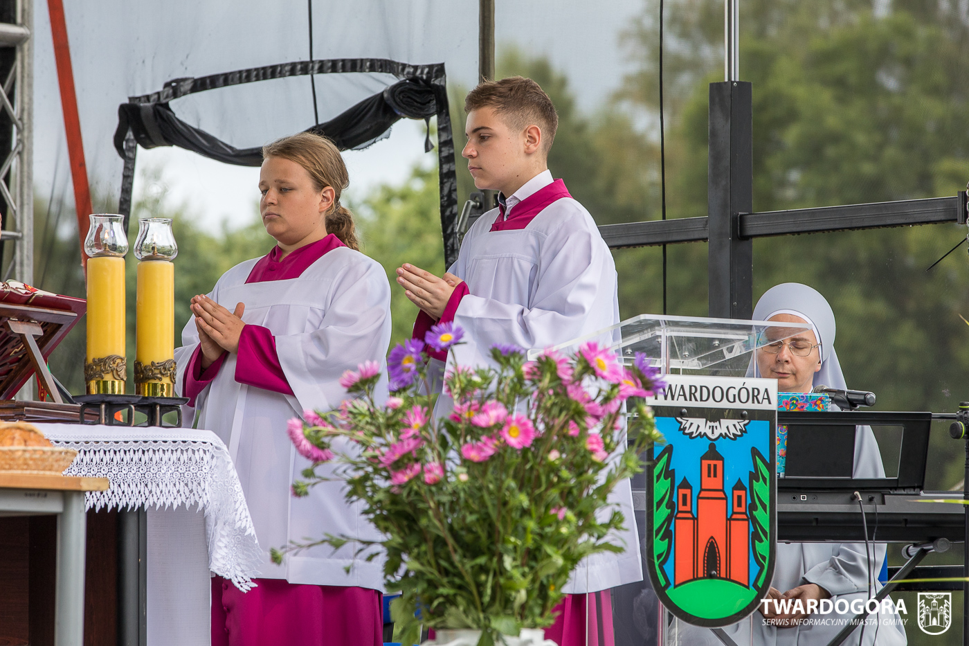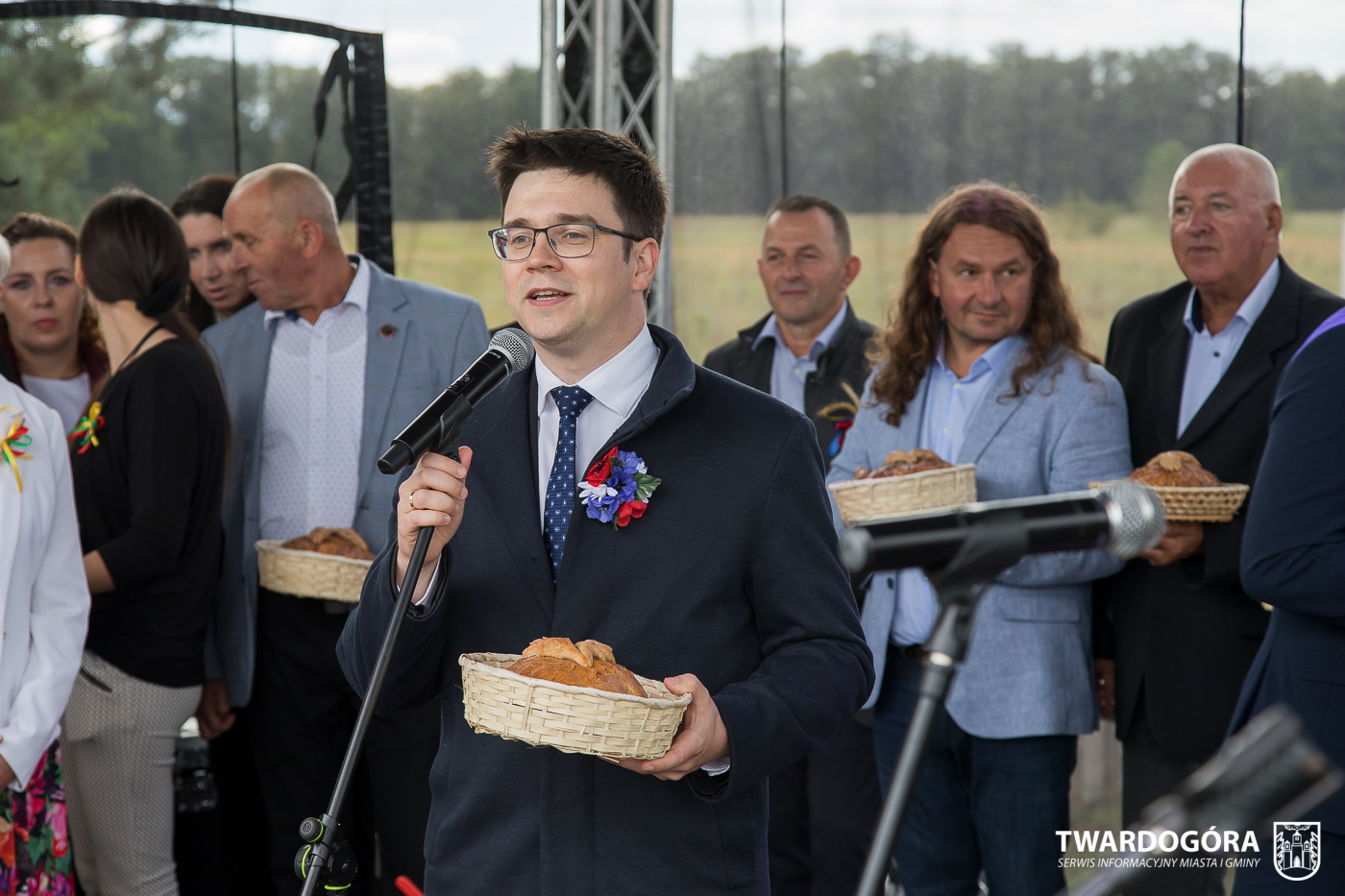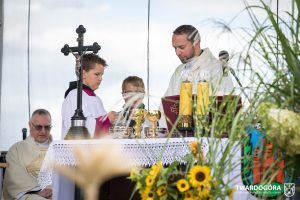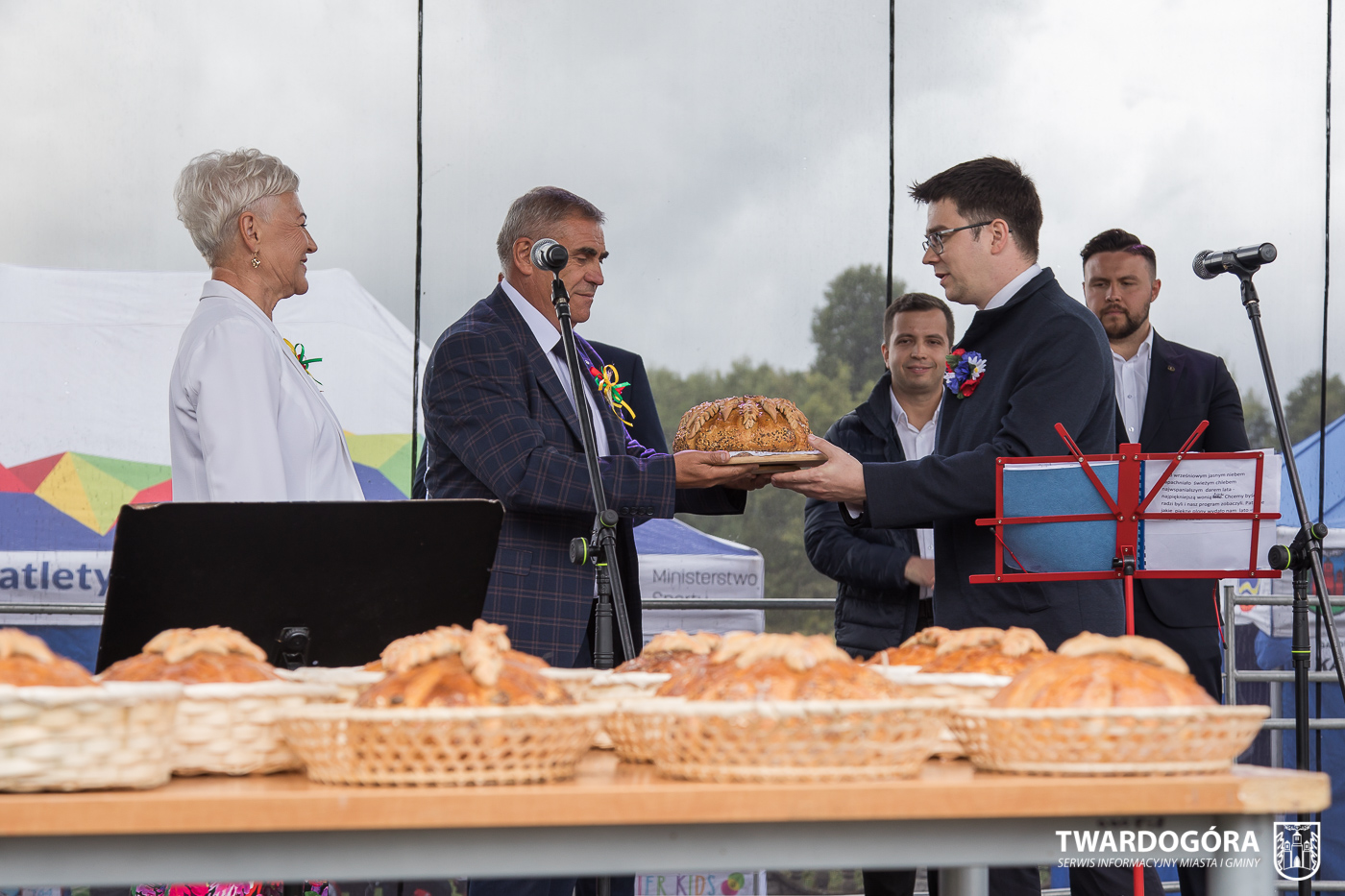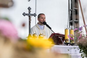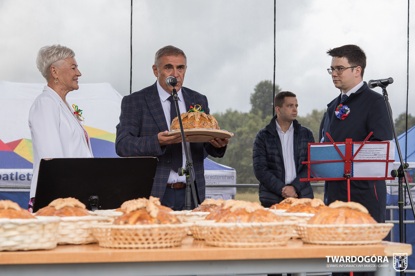 O godzinie 15.00 odprawiona została uroczysta Msza Święta dziękczynna, koncelebrowana przez proboszcza twardogórskiej parafii ks. Tomasza Hawrylewicza oraz proboszcza parafii Goszcz ks. Jana Napierałę. Po nabożeństwie poświęcono chleby, wieńce i kosze z plonami złożone pod ołtarzem polowym, a następnie starostowie przekazali symboliczny bochen burmistrzowi oraz wszystkim zgromadzonym delegacjom. Andrzej Zarówny przeczytał również list od członkini Zarządu Województwa Dolnośląskiego Natalii Gołąb.