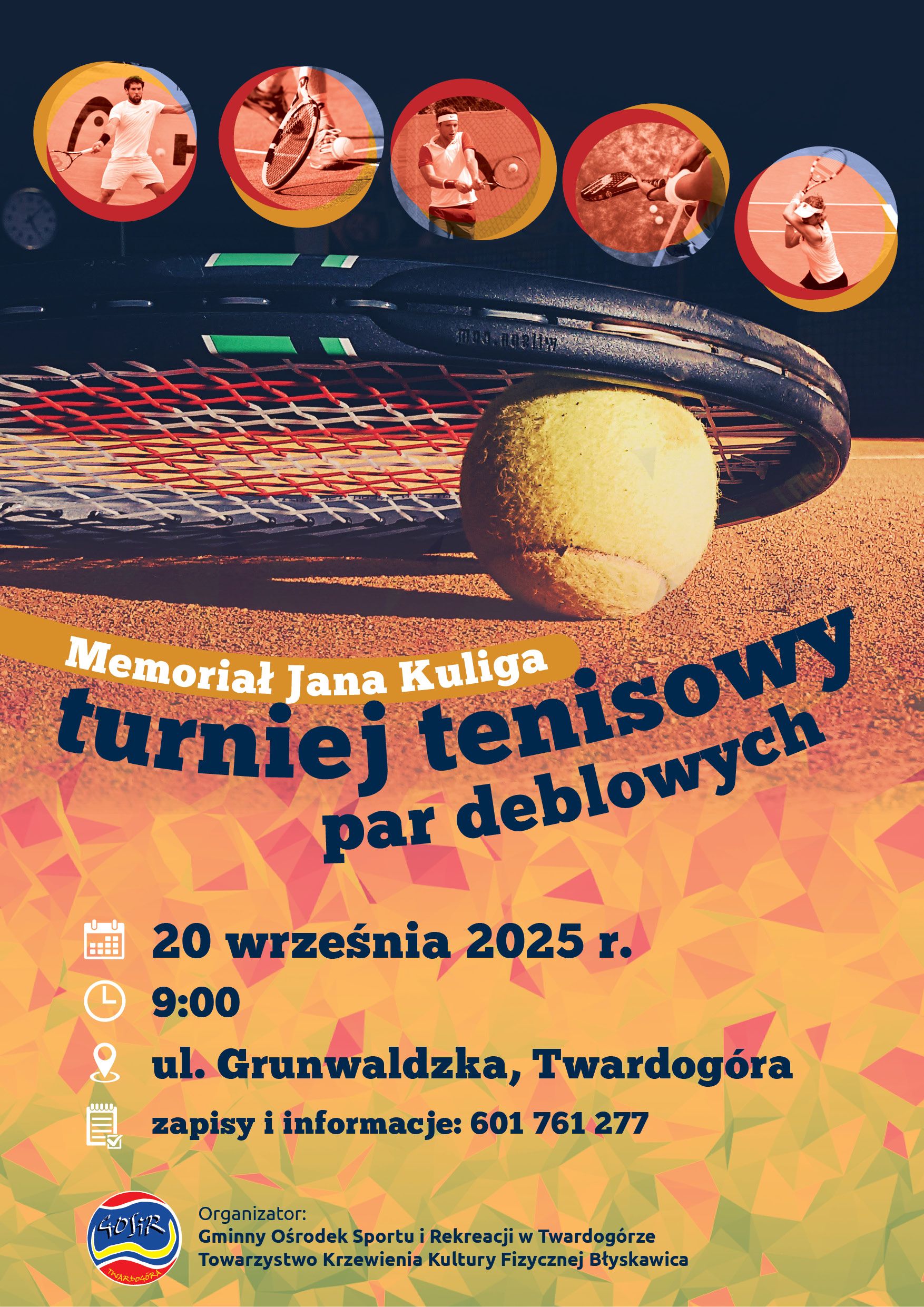 Zapraszamy na Memoriał Jana Kuliga – Turniej Tenisowy Par Deblowych, który odbędzie się w dniu 20 września 2025 r. o godz. 9.00 na kortach przy ul. Grunwaldzkiej w Twardogórze. Zapisy i informacje: 601-761-277.
