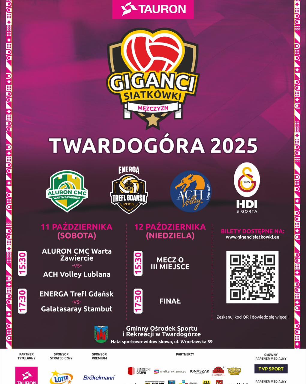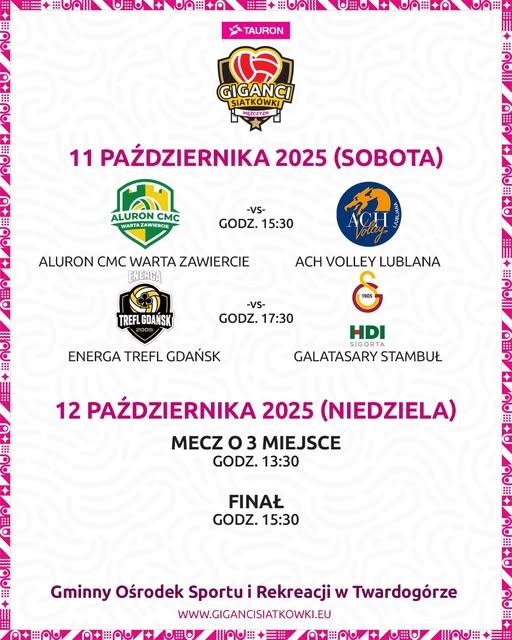 Informujemy, że stacjonarna sprzedaż biletów w recepcji hali GOSiR-u na mecze TAURON GIGANCI SIATKÓWKI rozgrywanych w dniach 11 i 12 października 2025 r. w hali sportowo-widowiskowej GOSiR-u w Twardogórze przy ul. Wrocławskiej 39 odbywa się według następującego harmonogramu: